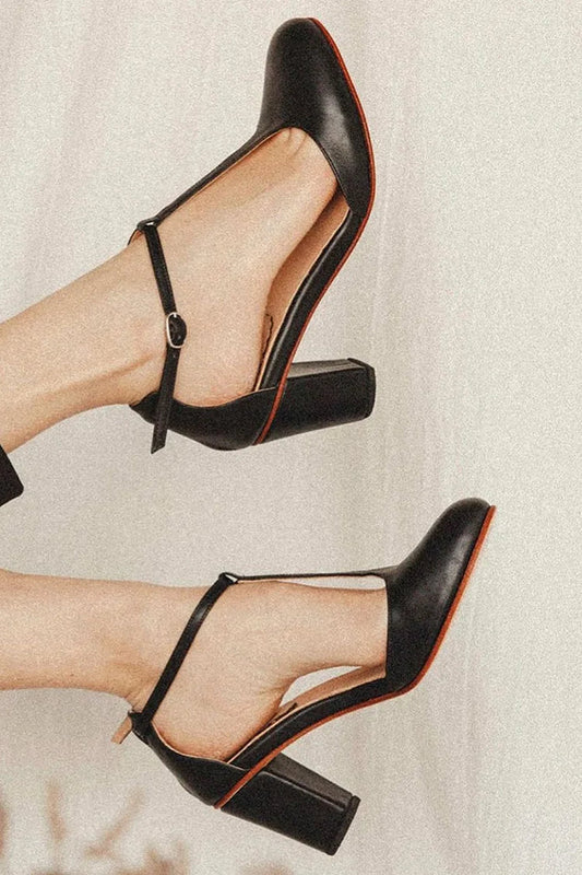 Punta tonda tinta unita cinturino a T fibbia tacco grosso nero [Preordine]