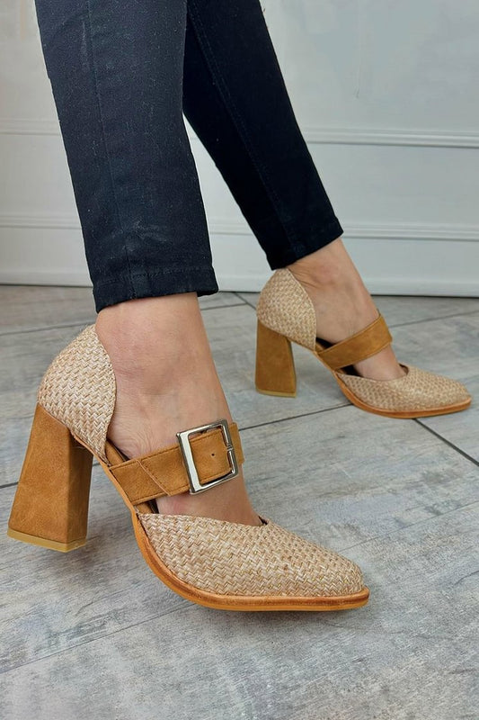 Scarpe con tacco grosso beige con punta affilata, fibbia e cinturino color block [Pre-ordine]