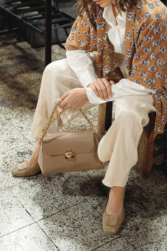 Mocassini color cachi con punta tonda, decorazioni in metallo e dettagli cuciti [Pre-ordine]