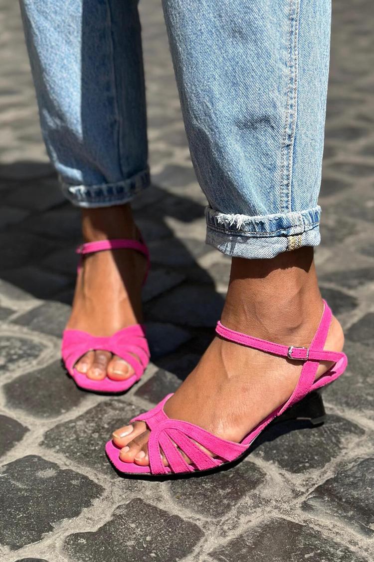 Sandali con tacco basso rosa, punta quadrata traforata e cinturino alla caviglia con fibbia [Pre-ordine]
