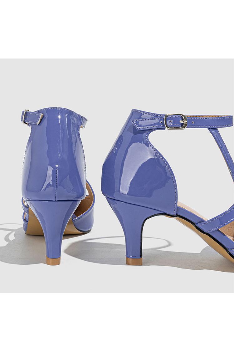 Sandali con tacco a gattino viola con cinturino alla caviglia e cerniera, punta affilata