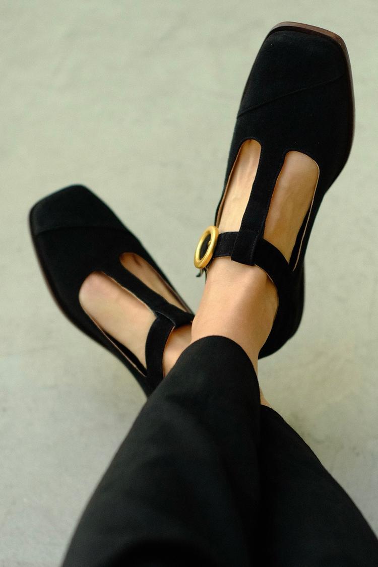 Scarpe basse nere con punta quadrata, cinturino a T in tinta unita e fibbia [Pre-ordine]