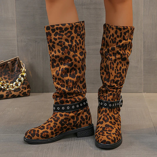 Stivali lunghi con cinturino e fibbia decorati con stampa leopardata, punta tonda, tacco basso e blocco