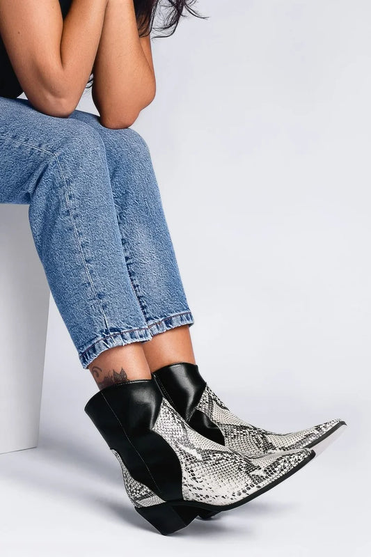 Stivali neri con punta tonda e stampa serpente, tacco grosso e toppe [Pre-ordine]