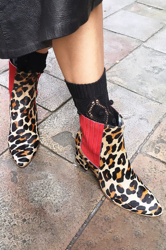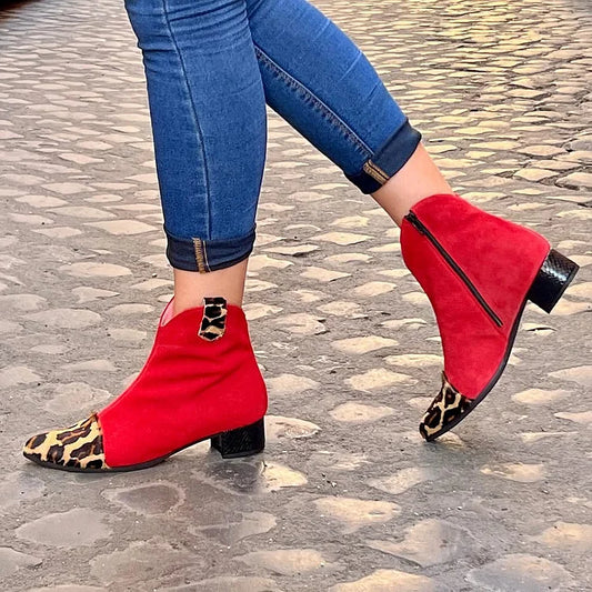 Stivali rossi con tacco grosso e punta a punta, stampa leopardata patchwork [Pre-ordine]