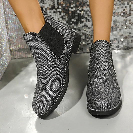 Stivaletti alla caviglia con punta tonda e tacco basso a blocco, decori in metallo patchwork