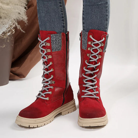 Stivali a metà polpaccio con lacci e tacco basso a blocco e punta tonda patchwork