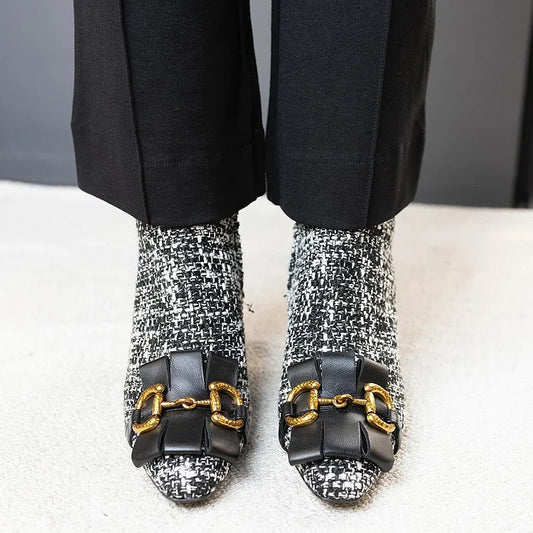 Stivaletti alla caviglia con cinturino a catena, fibbia decorativa, punta affilata, tacco basso a blocco