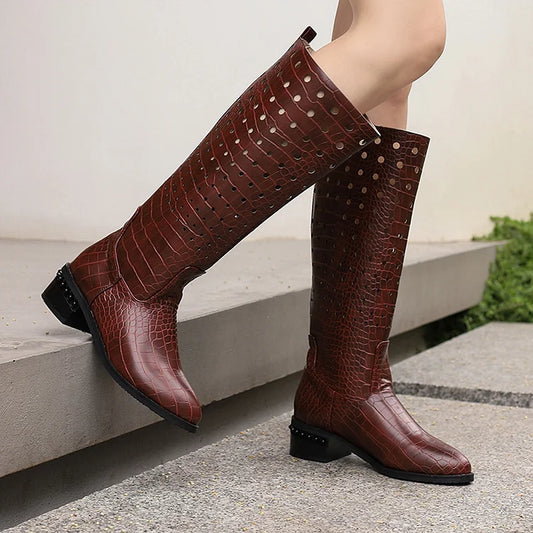 Stivali alti fino al ginocchio con punta rotonda e tacco spesso, stampa coccodrillo