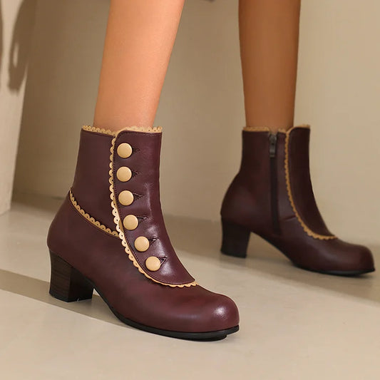 Stivaletti alla caviglia con punta rotonda, tacco spesso, finiture color block e bottoni