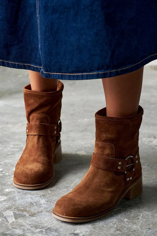 Stivaletti marroni con punta tonda e cinturino a O-ring e tacco spesso [Pre-ordine]