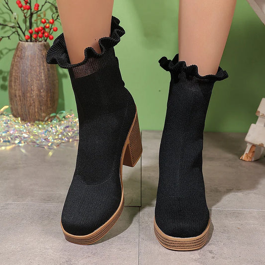 Stivali alti con punta rotonda, volant in maglia e tacco spesso