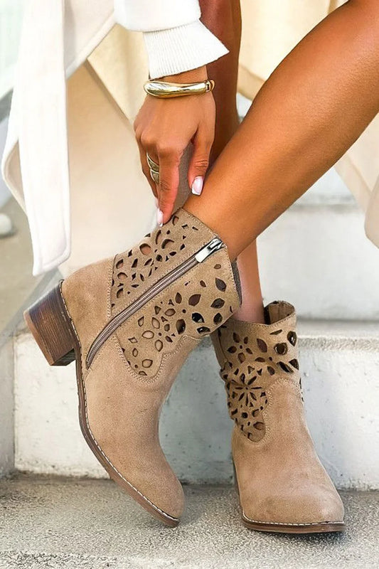 Stivaletti alla caviglia color cachi con punta affilata, tacco spesso, cerniera e traforati [Pre-ordine]