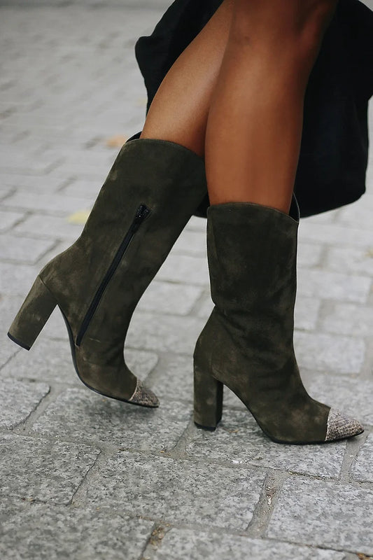 Stivali alti verde scuro con punta affilata e tacco spesso con stampa serpente [Pre-ordine]