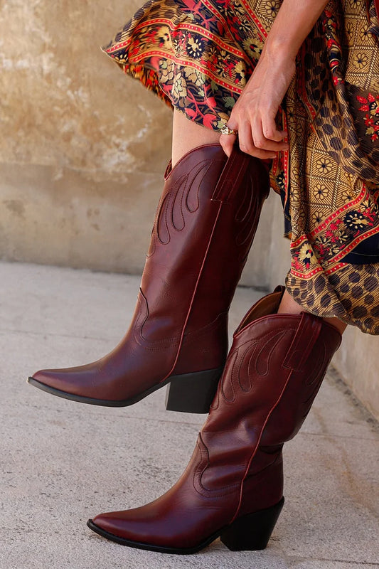 Stivali medi bordeaux tinta unita con patchwork a punta [Pre-ordine]