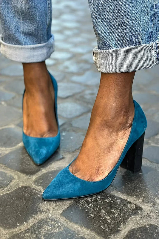 Eleganti scarpe con tacco grosso blu a punta tinta unita [Pre-ordine]