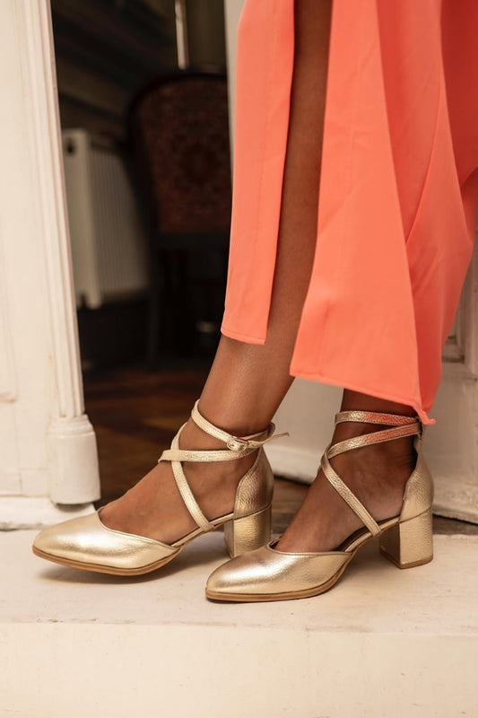 Décolleté con tacco a blocco e cinturino color oro metallizzato [Pre-ordine]