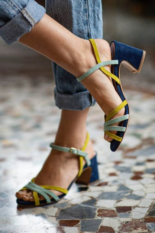Sandali con cinturino elastico e tacco basso e punta aperta colorblock [Pre-ordine]