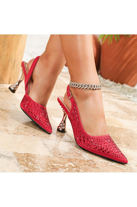 Sandali con tacco a spillo, cinturino alla caviglia con fibbia, decorazioni geometriche in strass