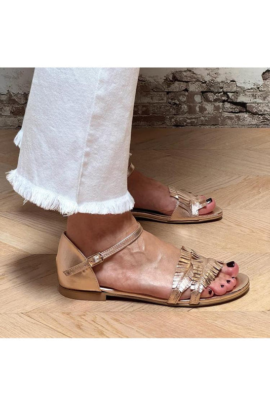 Sandali dorati con punta tonda, fibbia con cinturino incrociato e nappe decorative [Pre-ordine]