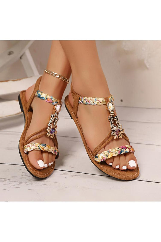 Sandali con punta tonda, decori floreali e cinturino intrecciato multicolore in stile boho