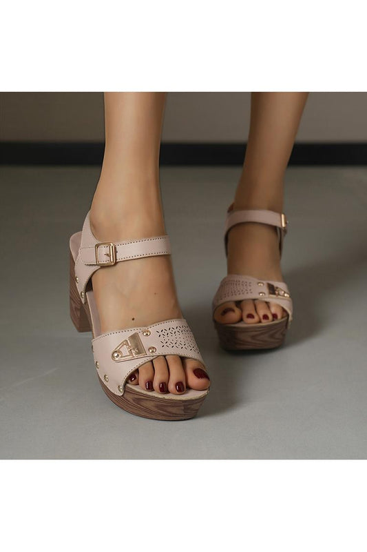 Sandali casual con tacco, punta tonda, tinta unita, con borchie in metallo traforate
