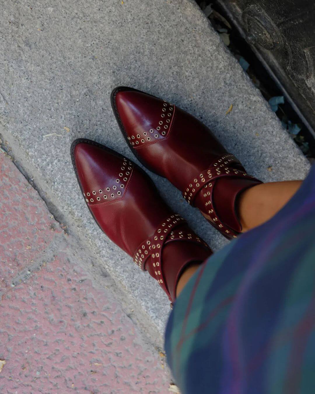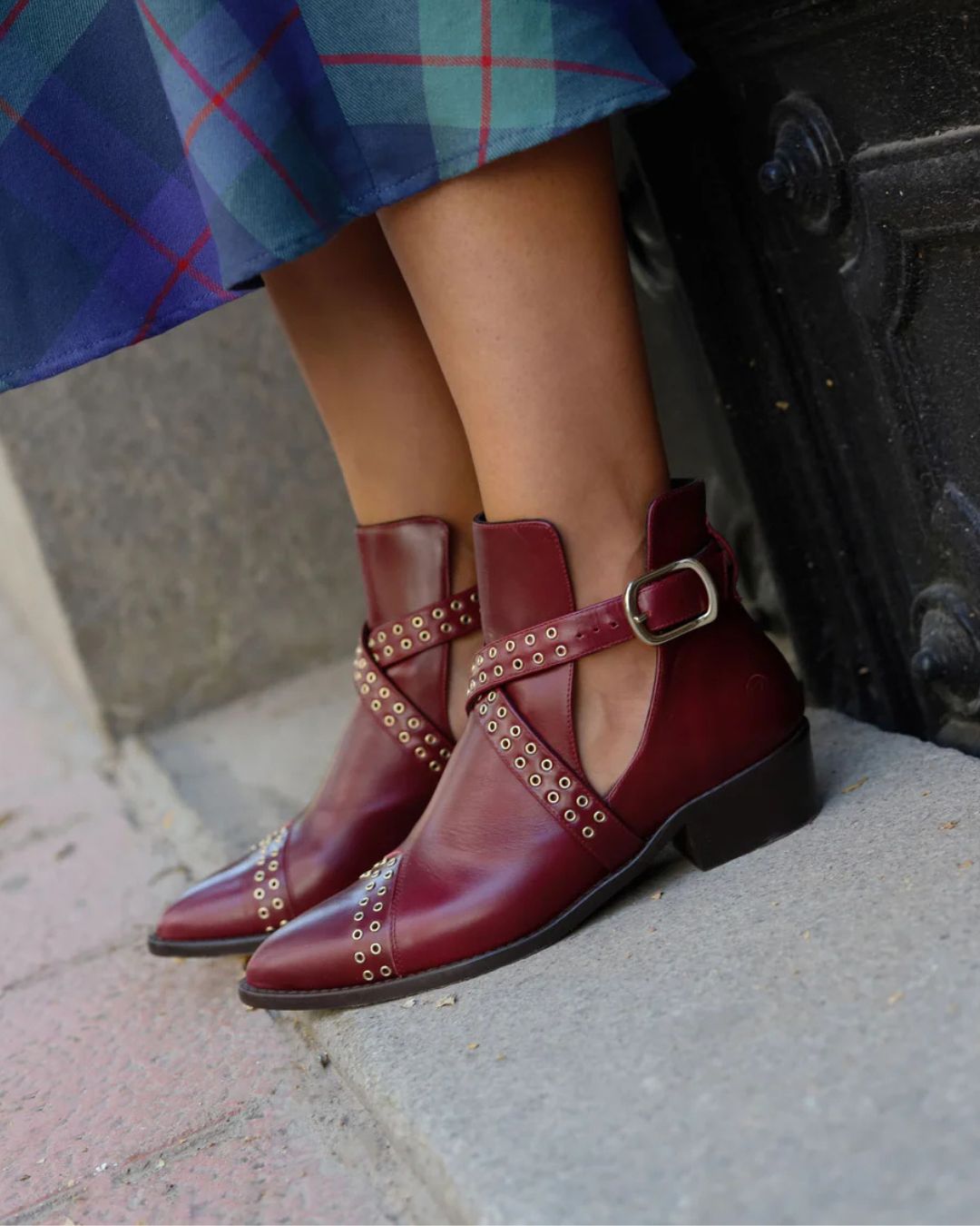 Stivaletti alla caviglia bordeaux con borchie, cinturino incrociato, punta a punta e cut-out
