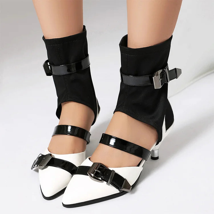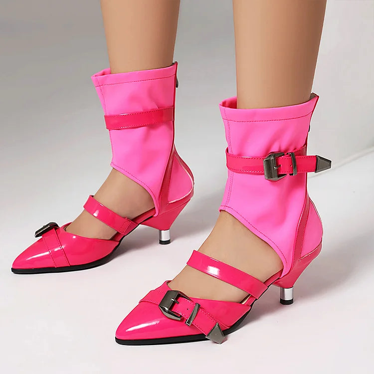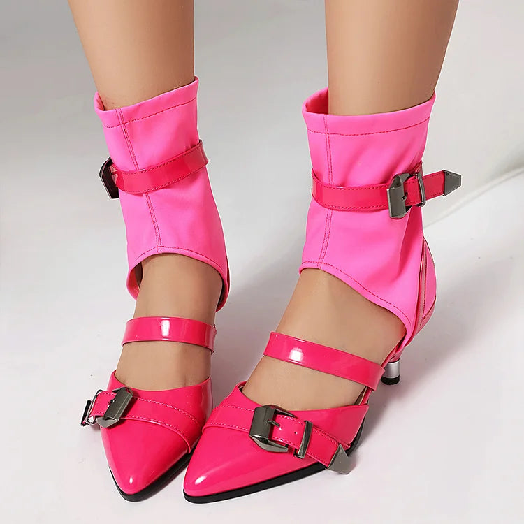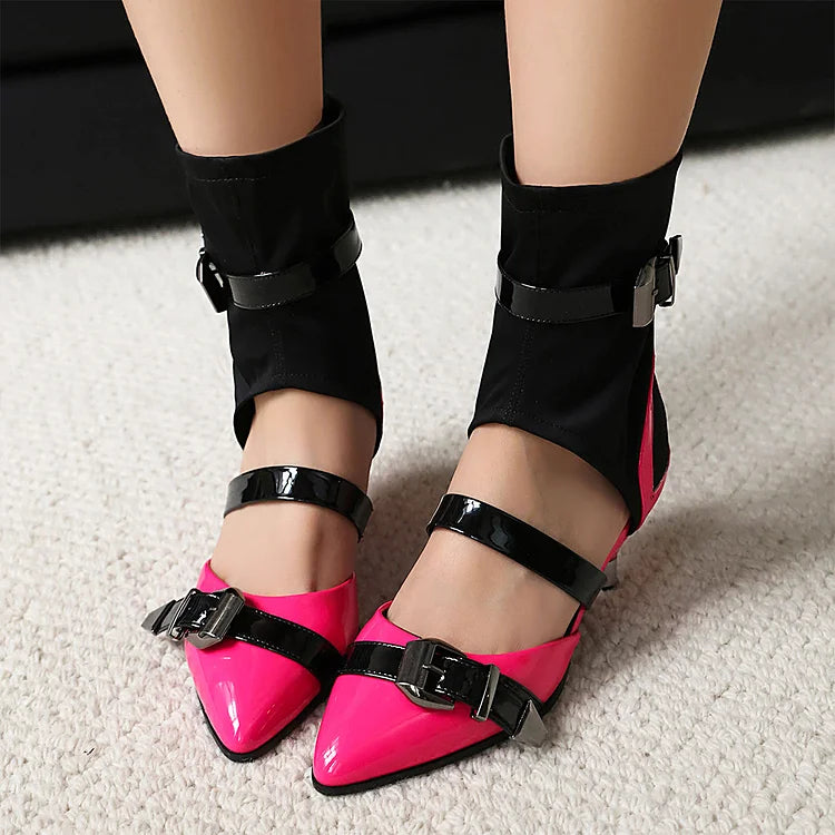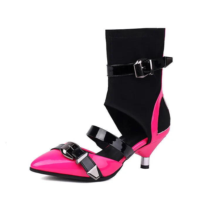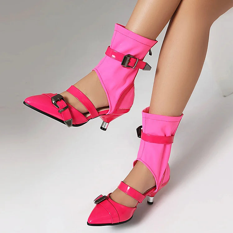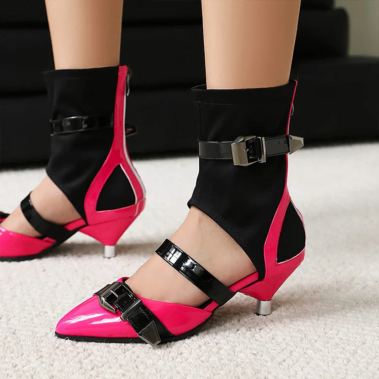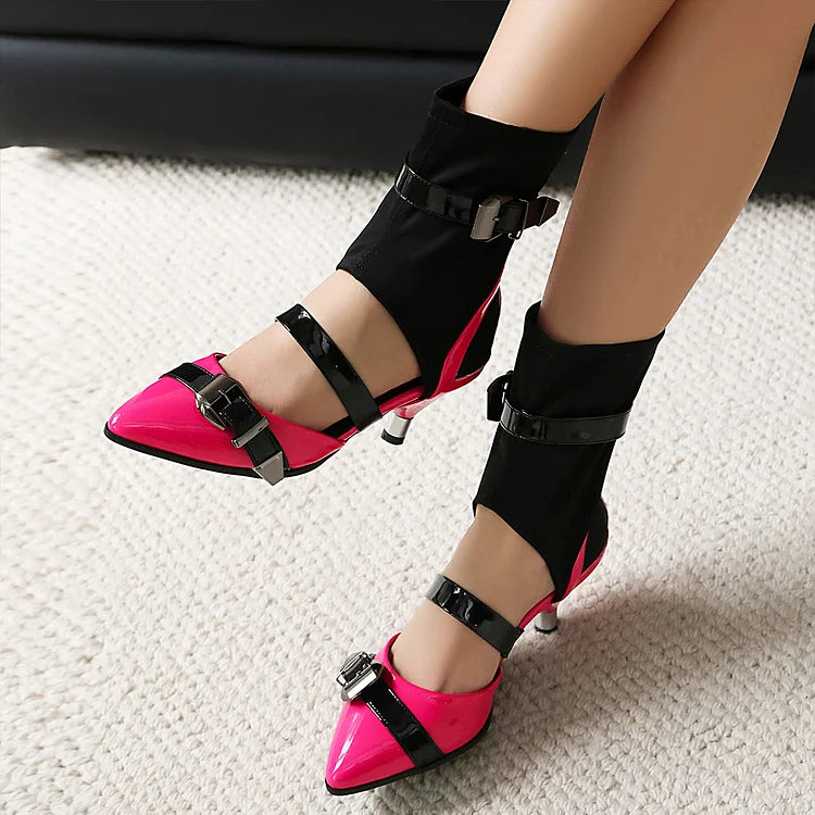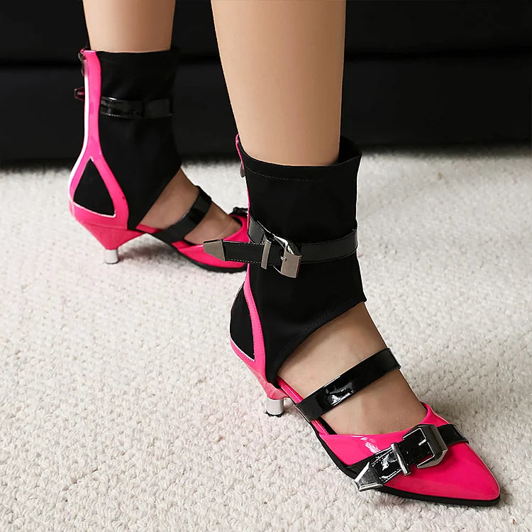 Sandali alti con cinturini multipli colorblock e fibbie, punta affilata