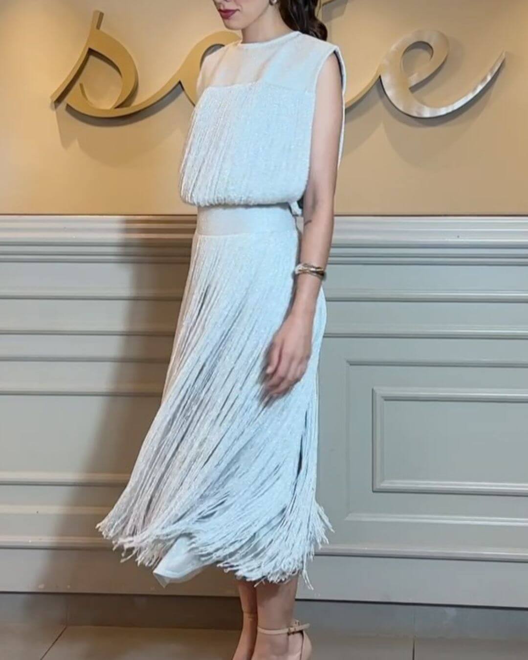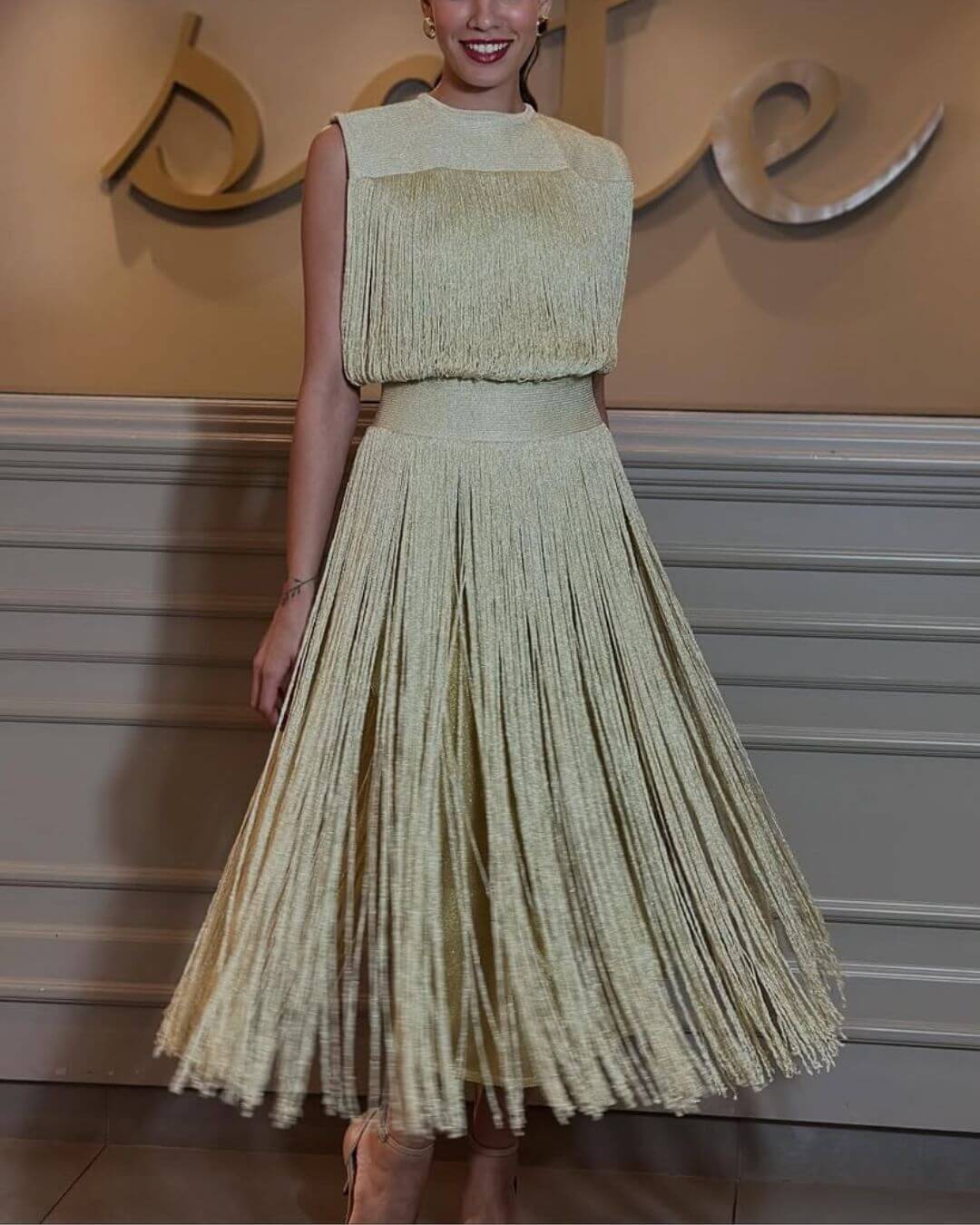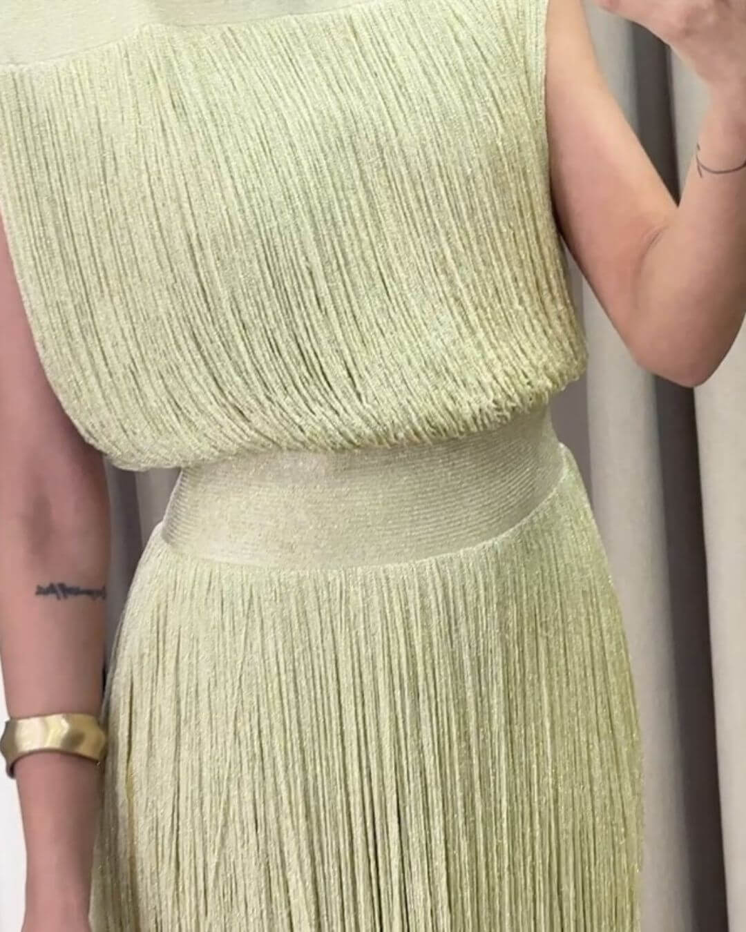 Sii elegante e comoda con il nostro abito lungo con frange verde chiaro, che fonde lusso ed eleganza moderna. Caratterizzato da nappe scintillanti ad alta densità, emana una luce morbida e accattivante a ogni passo.