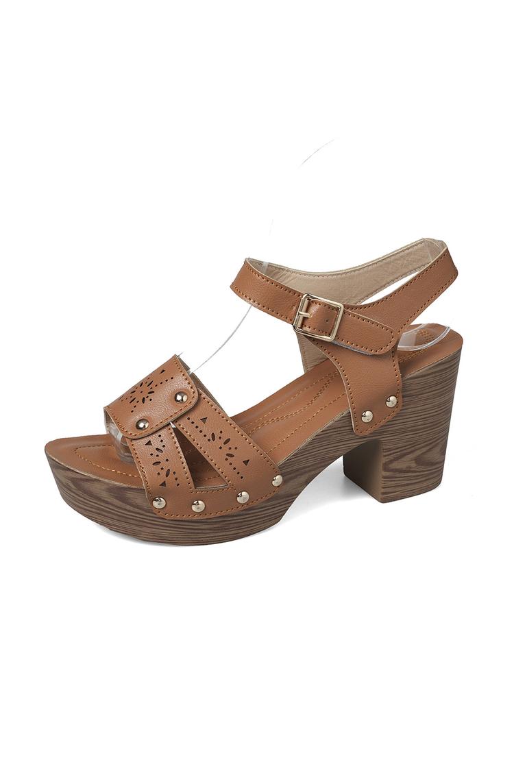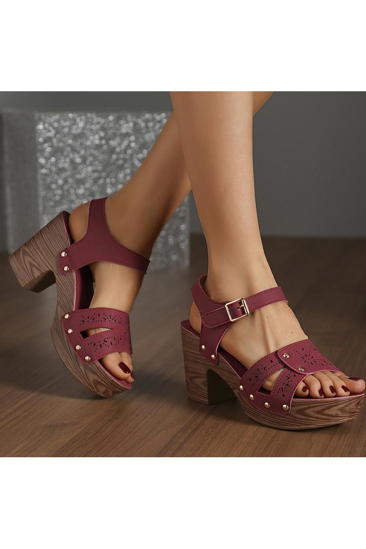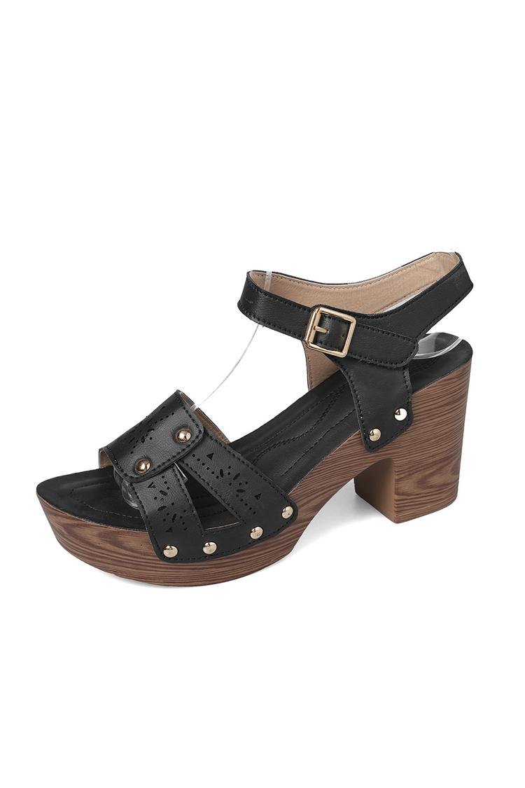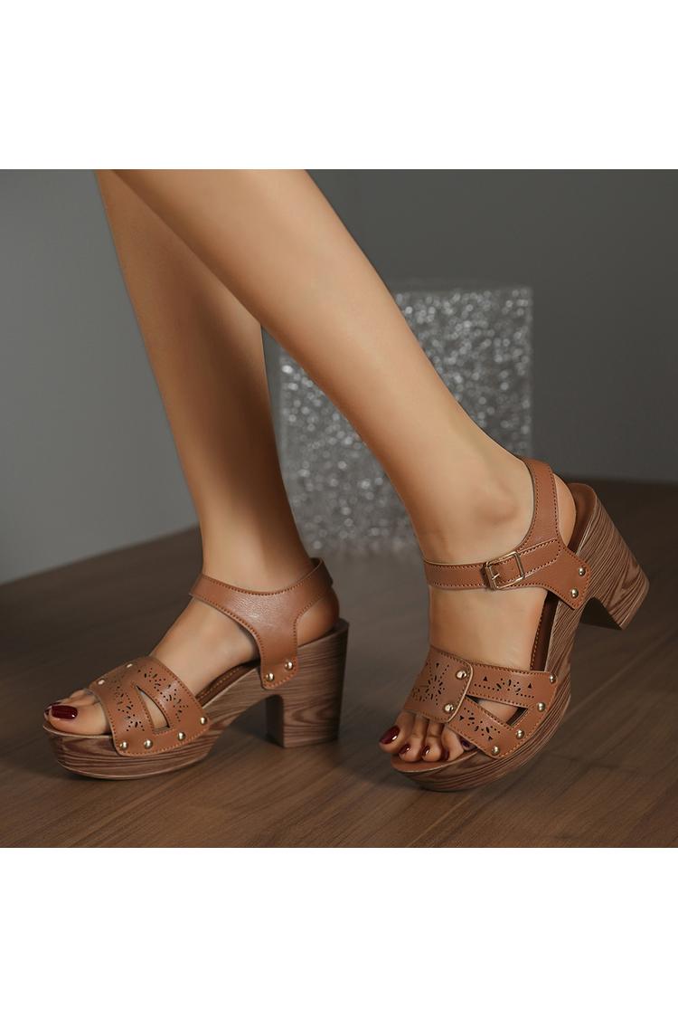 Sandali casual con tacco, punta tonda, tinta unita, con borchie in metallo traforate
