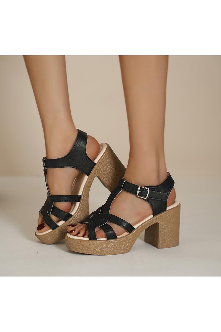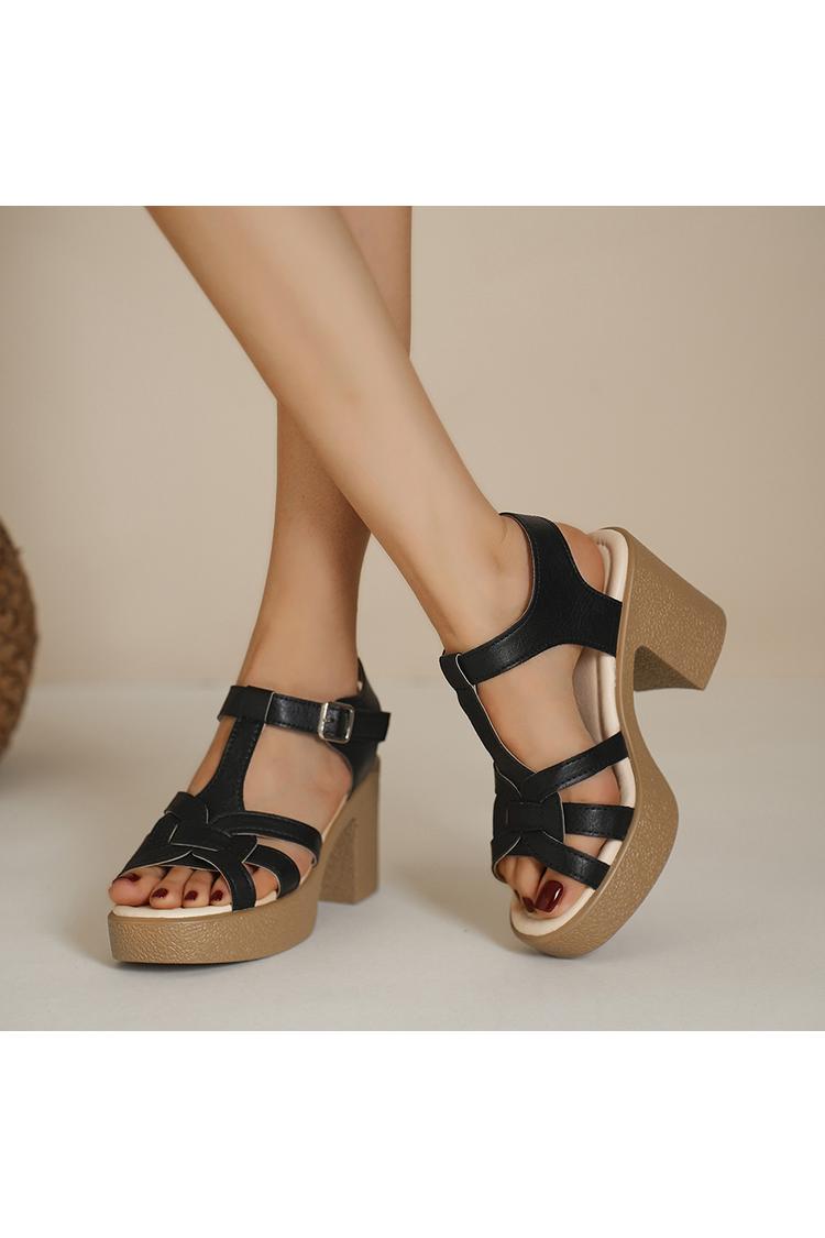 Sandali con tacco, punta tonda e fibbia, tinta unita, cinturino a T