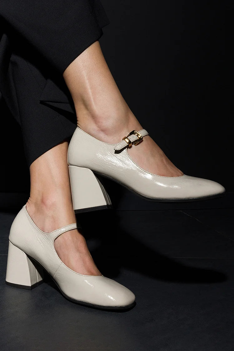 Cinturino sul collo del piede con fibbia, punta rotonda, tacco spesso color avorio [Pre-ordine]