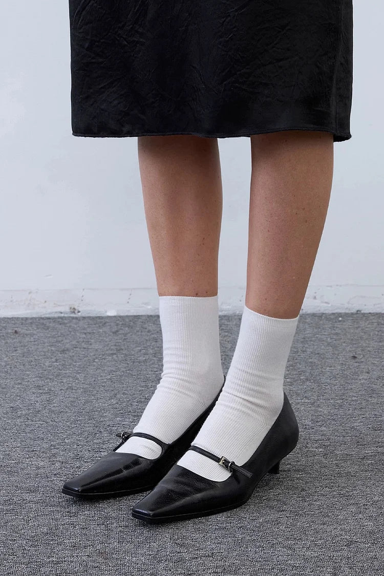 Cinturino sul collo del piede con fibbia, tinta unita, punta quadrata, tacco a gattino in pelle