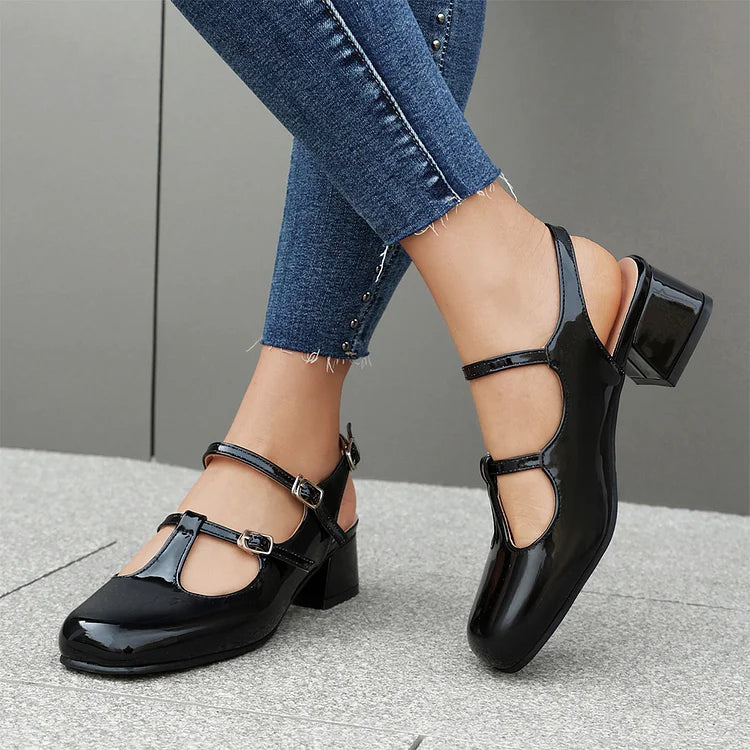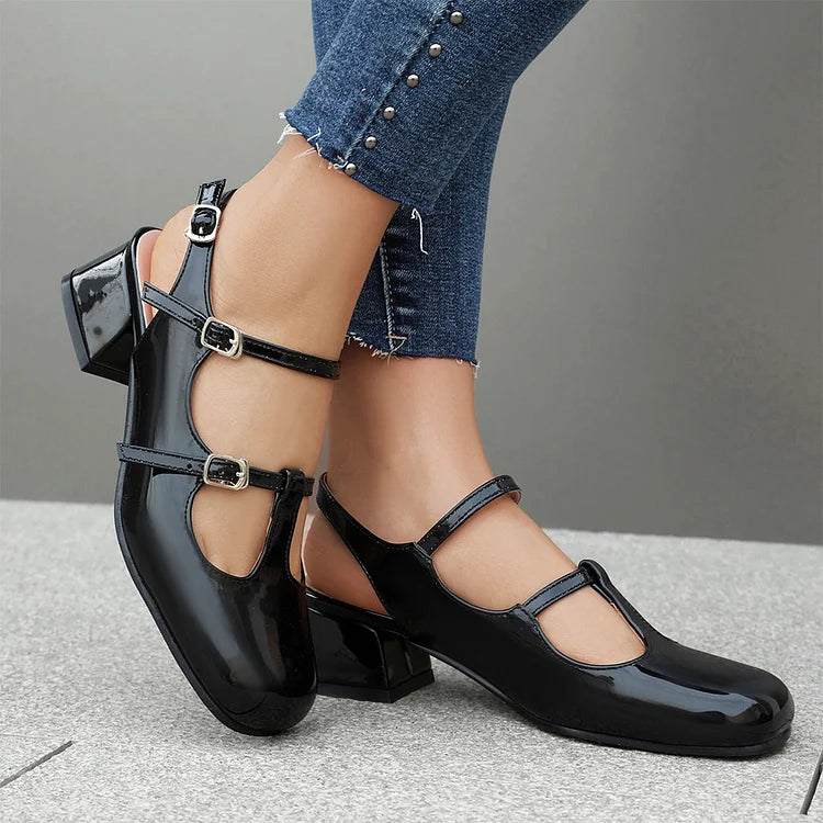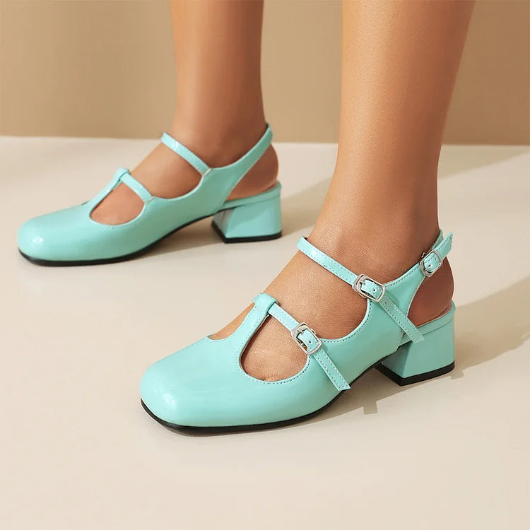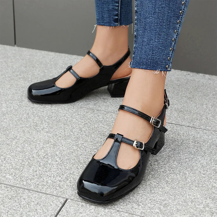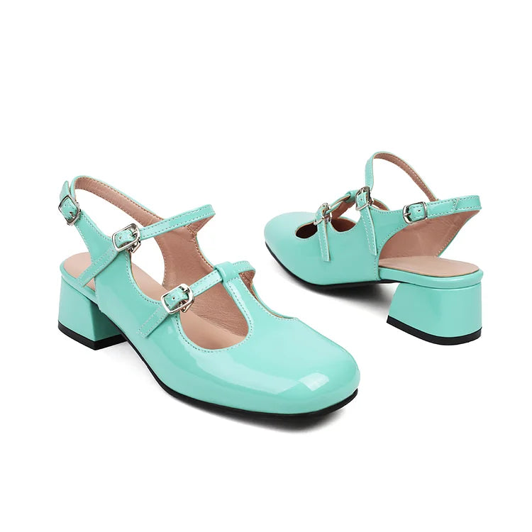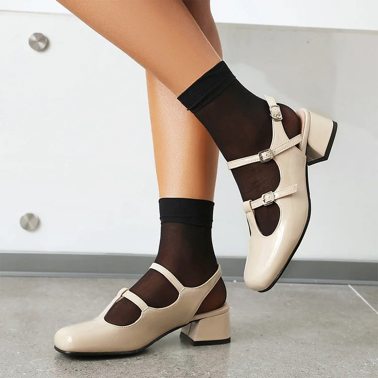 Cinghie sul collo del piede, fibbie, tinta unita, punta quadrata, cinturino posteriore, tacco grosso