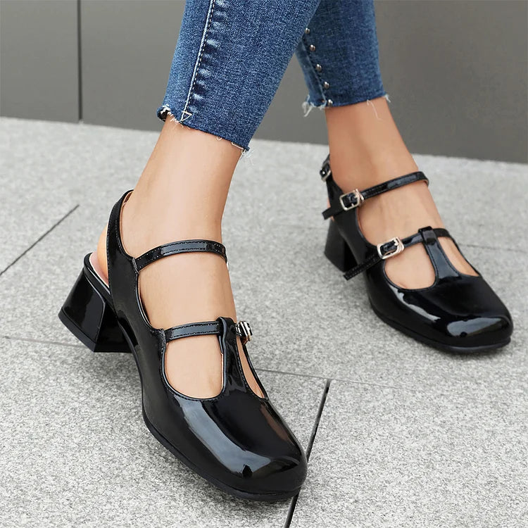 Tacchi bassi casual con cinturino marrone e fibbia chunky