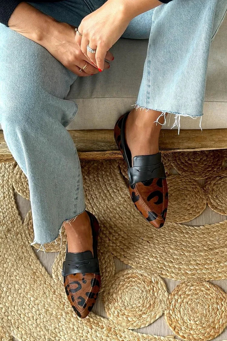 Mocassini marroni con punta scure e stampa leopardata patchwork [Pre-ordine]