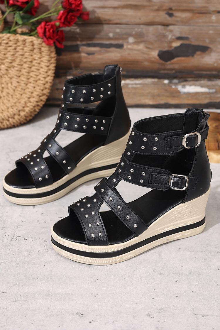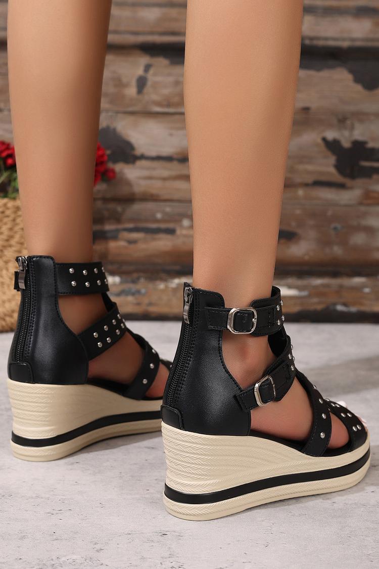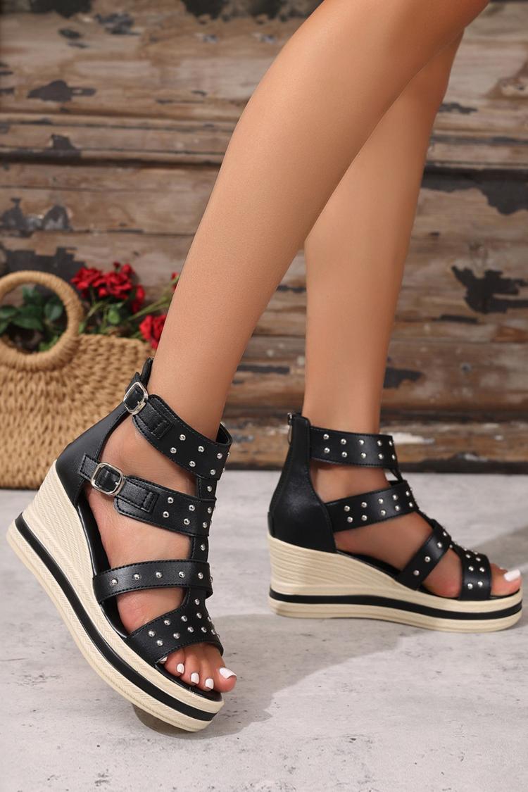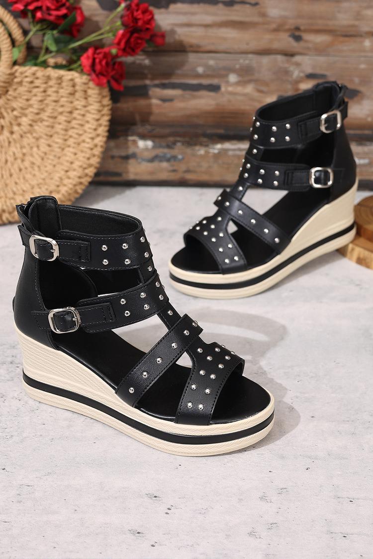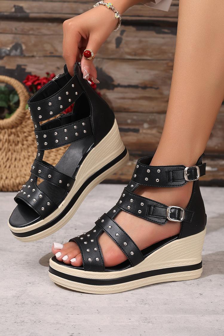 Sandali con zeppa, punta tonda, fibbia e cinturino alla caviglia decorati con rivetti metallici