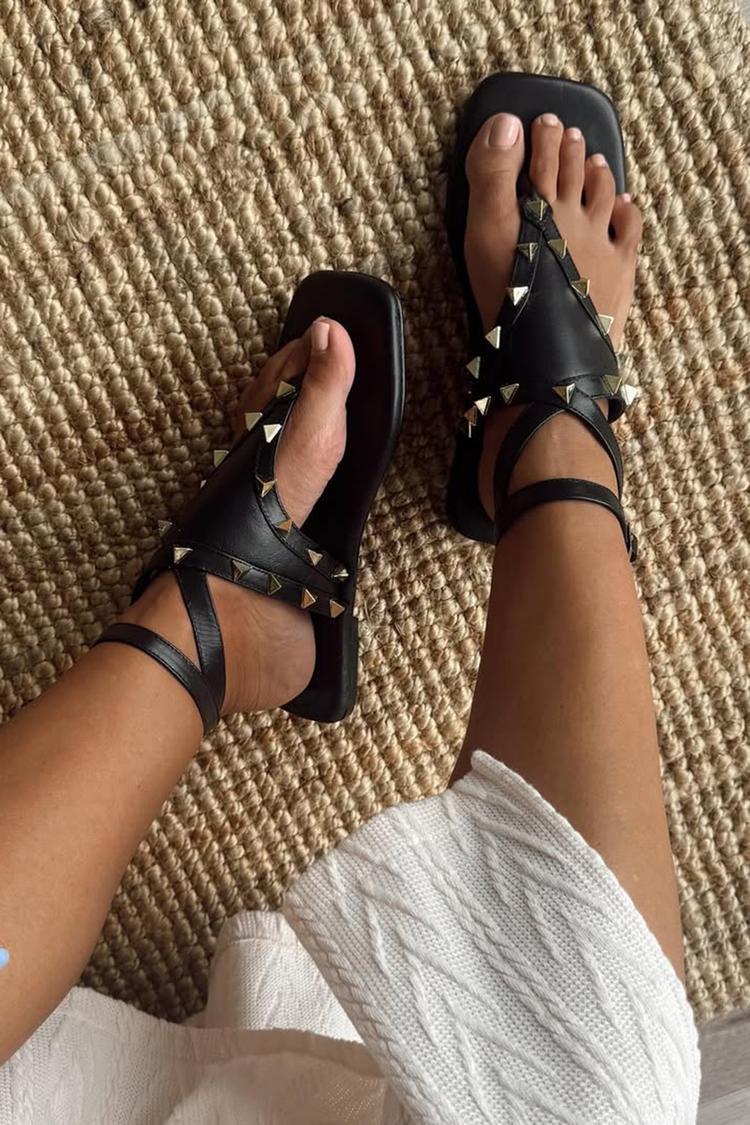 Sandali neri con punta quadrata, cinturino alla caviglia con fibbia e rivetti in metallo [Pre-ordine]