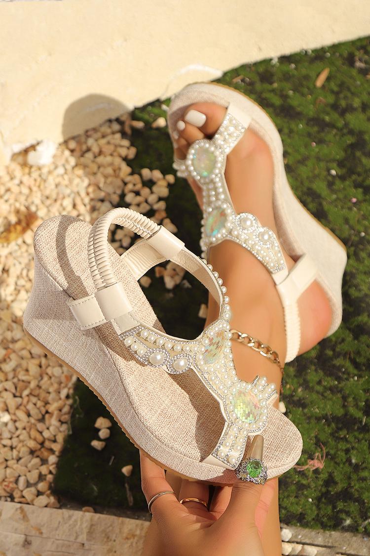 Sandali con zeppa a punta tonda in stile boho con decorazioni in strass di perle