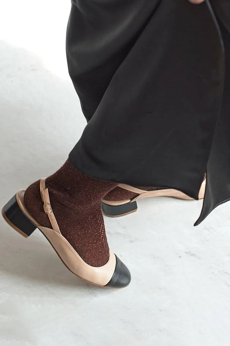 Sandali con tacco beige con cinturino posteriore e punta affilata, rifiniture grezze colorblock