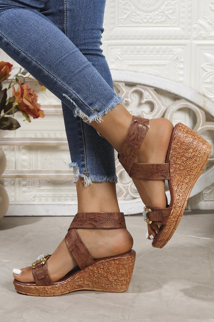 Sandali con zeppa, punta tonda, cinturino alla caviglia con stampa serpente e decorazioni in strass