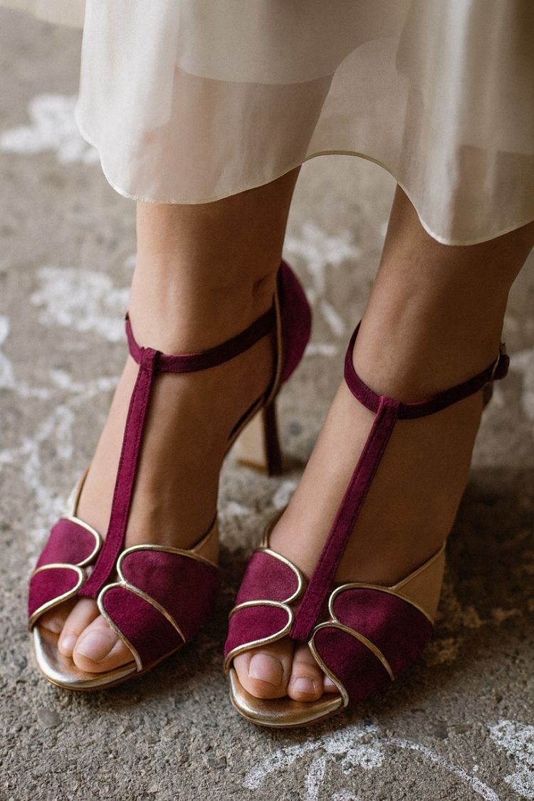 Sandali con tacco e cinturino a T in pelle scamosciata rosso vino con finiture dorate [Pre-ordine]