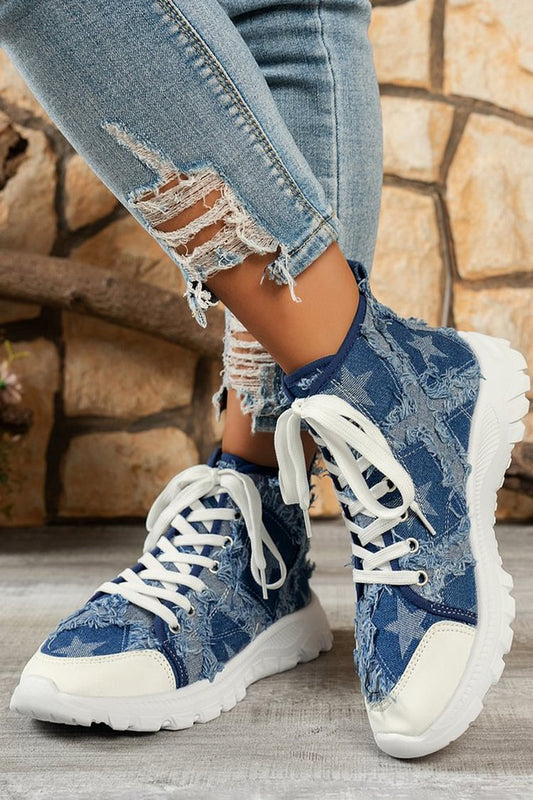 Sneakers con punta tonda e lacci, motivo a stelle, rifiniture grezze, patchwork