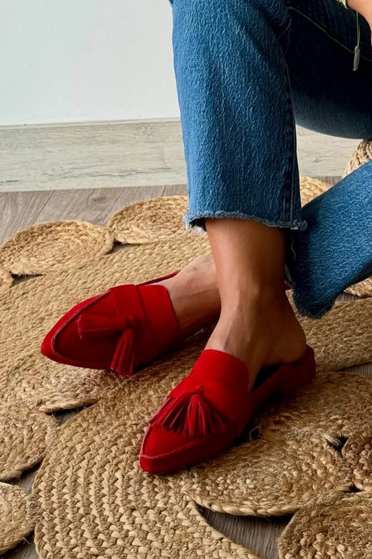 Mules rosse con punta a punta e decori in tinta unita con nappe [Pre-ordine]