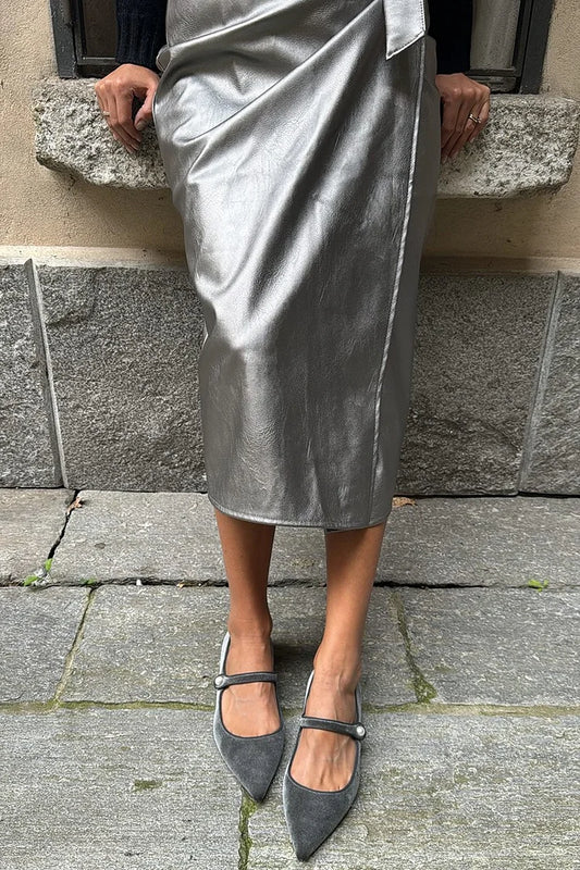 Scarpe basse grigie con cinturino in velluto sul collo del piede e fibbia a punta