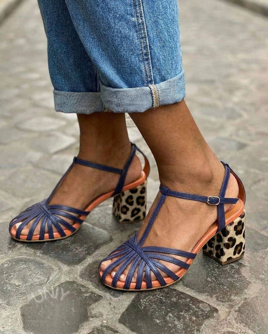 Sandali con tacco a blocco e cinturino a T in tessuto blu navy con stampa leopardata [Pre-ordine]