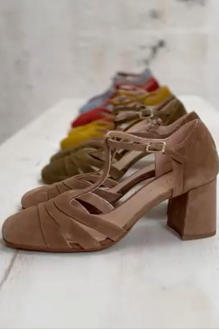 Scarpe con tacco a blocco in pelle scamosciata oliva con cinturino posteriore e dettagli a punta