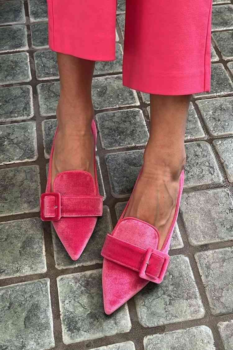 Mocassini a punta con cinturino oversize in velluto e fibbia