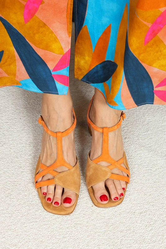Tacchi grossi marrone chiaro con cinturino incrociato patchwork punta quadrata