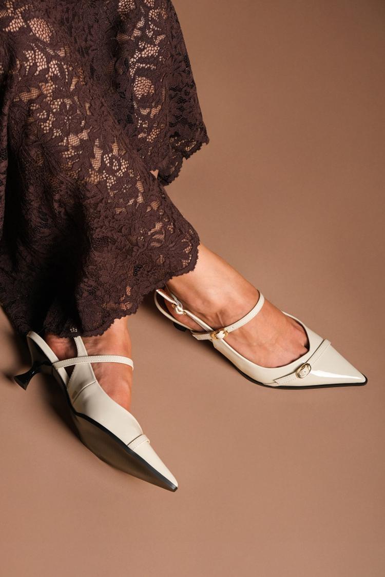 Sandali con tacco a spillo, cinturino sul collo del piede, fibbia, punta affilata, colore avorio [Pre-ordine]